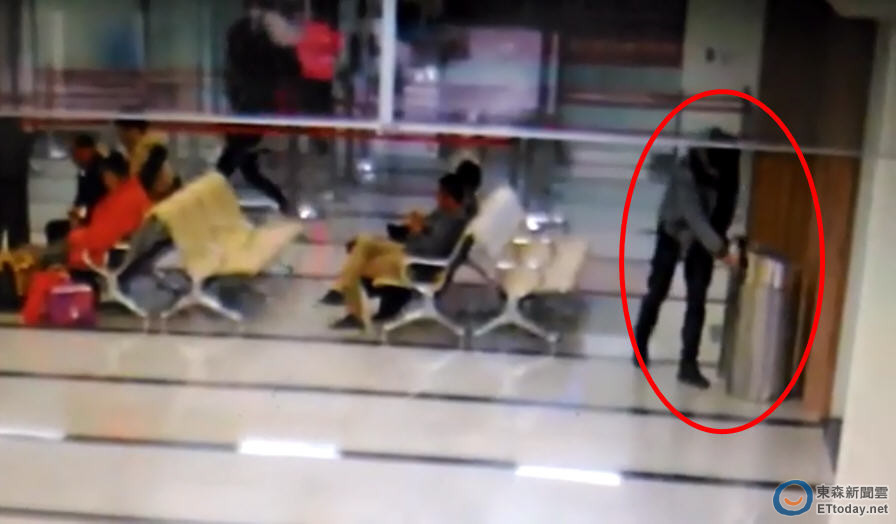 ▲已經進入安檢線的吳姓男子,突然回頭走到機場大廳,朝垃圾桶丟了一包物品。(圖/記者楊佩琪翻攝)