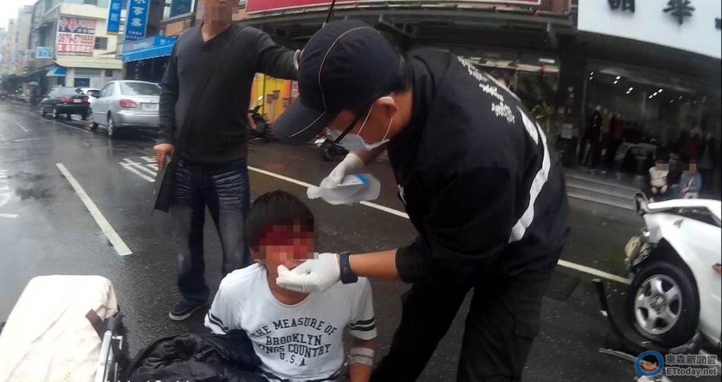 第一大隊湖內分隊指出,隊員歐錦煌、康汝瑋、役男劉宇謙駕駛救護車趕往現場,救護人員快速評估傷勢,發現有3名傷者,其中一名男性(鄭00,28歲)雙眼上方有一道約10公分撕裂傷鮮血直流、左膝有一約3公分撕裂傷,全身疑似因疼痛而狂發抖;另外,2名同姓(林)傷患(男53歲,女46歲)身上有多處擦傷。
