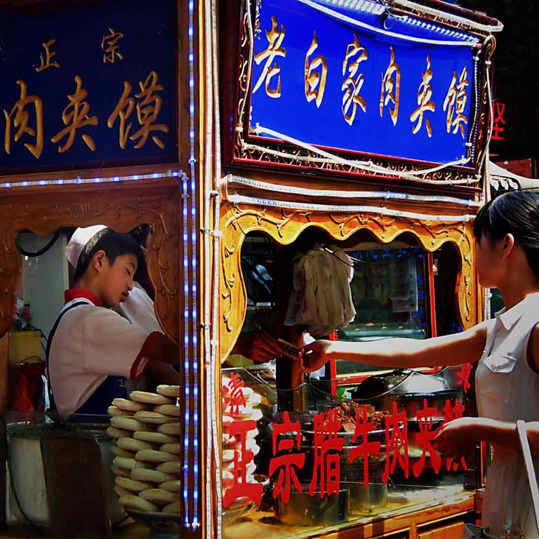 ▲在陝西西安市回民小吃街上,一位遊客在購買當地的特色小吃肉夾饃。(圖/新華社提供)