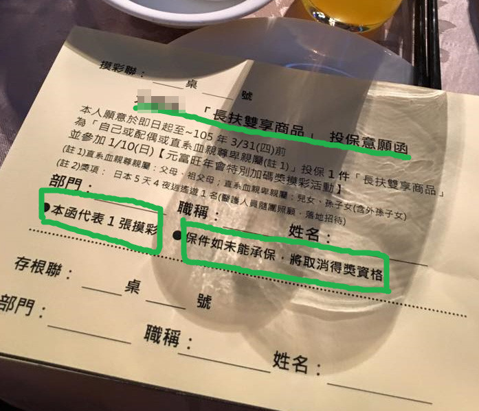 有間證券公司的員工日前PO文表示,公司辦尾牙時,竟然在桌上發給每個人一張「保險意願書」,上面寫著「保件如未能承保,將取消得獎資格」,用意是要詢問他們為自己或家人投保的意願,若同意才能參加抽獎。換句話說就是,如果員工真的中獎,但沒有幫自己或家人投保的話,是沒有資格領獎的。