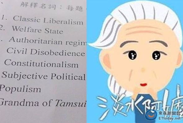 國民黨總統參選人朱立倫在辯論會中大打「阿嬤牌」,決定參選是受到一位淡水阿嬤的鼓勵,更掀起一陣風潮,沒想到,這股效應也成為大學的期末考考題!東海大學政治系副教授沈有忠在臉書PO文,這次期末考「名詞解釋」第八題中,要求同學就「淡水阿嬤」進行名詞解釋與各自表述,結果獲得五花八門的答案,直呼「對台灣民主充滿信心了」。