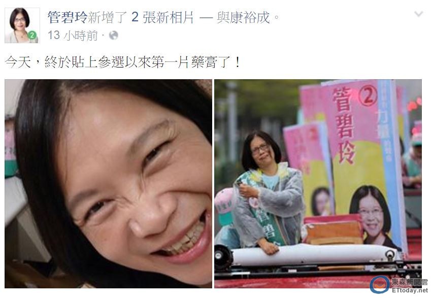 管碧玲有堅強的陣容陪她拜票,分別有陳菊、謝長廷、葉菊蘭三位政壇老將,以及6位縣市長潘孟安、林佳龍、林右昌、林智堅、李進勇、陳光復等出現在管媽的隊伍,在選前最後幾天大力催票。連續多天行程滿檔的管媽,終於在手臂貼上酸痛藥布,管碧玲的支持者看了心疼,卻也不忘為她加油打氣。