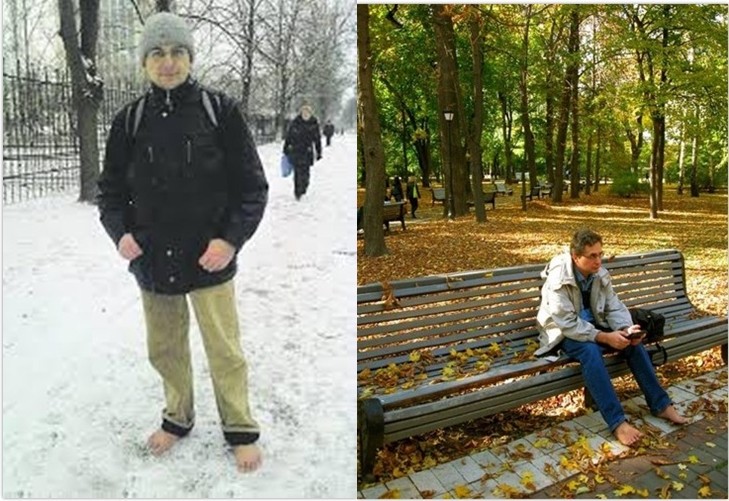 來自烏克蘭基輔的諾沃肖洛夫(Andrzej Novosiolov)10年前開始了不穿鞋的生活,無論是平地、石頭路還是泥巴地,都難不倒他,還曾經光腳走在零下7度的雪地上,雖然也曾誤踩碎玻璃導致雙腳受傷,還是要繼續堅持赤腳。