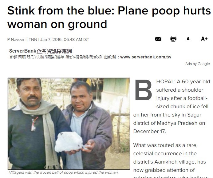 印度中央邦一名60歲婦人,上月17日走在街上無端被天降不明硬物砸傷,當地人還以為墜落的神祕冰塊是奇異珍寶,其實是從機艙掉落的糞便在半空中結成冰塊。所幸冰塊掉落時,先擊中屋頂降低了衝擊力,倒楣的婦人僅肩膀受傷,若是砸到了頭,恐怕性命難保。