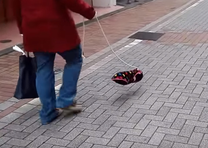 據了解,這位男子應該是藉由右手的抖動,讓觀眾產生視覺上的錯覺,誤以為真的有一隻小狗在散步。而這位男子左手還拿了一個提袋,推測狗叫聲可能是從那裡面發出來的。