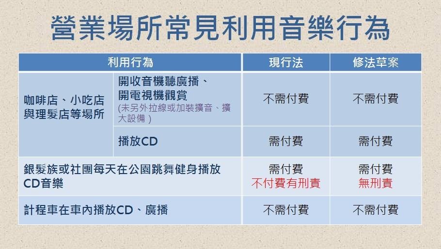 在公園播音樂亦屬公開利用音樂之情形,現行法只有非經常性活動才可以主張合理使用,所以如果是每天早上公園跳晨操等經常性活動播音樂,而沒有取得授權,就有可能面臨刑事責任,本局在此次修法草案考量其對社會大眾生活之影響,並兼顧音樂創作人之利益,刪除刑事責任,只要支付合理的使用報酬給著作權人即可使用。
