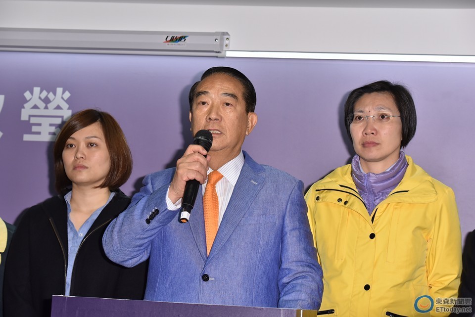 ▲宋楚瑜與徐欣瑩在晚間9時多抵達競選總部發表談話。(圖/記者李毓康攝,下同)