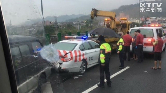 國道3號霧峰交流道南下出口15日下午1時許發生車禍,當時一輛警車停在內線車道處理一起追撞事故,前方是拖吊車,但一輛廂型車在未減速的情況下直接撞上「紅斑馬」,導致警車再撞上拖吊車,變成夾心餅乾。
