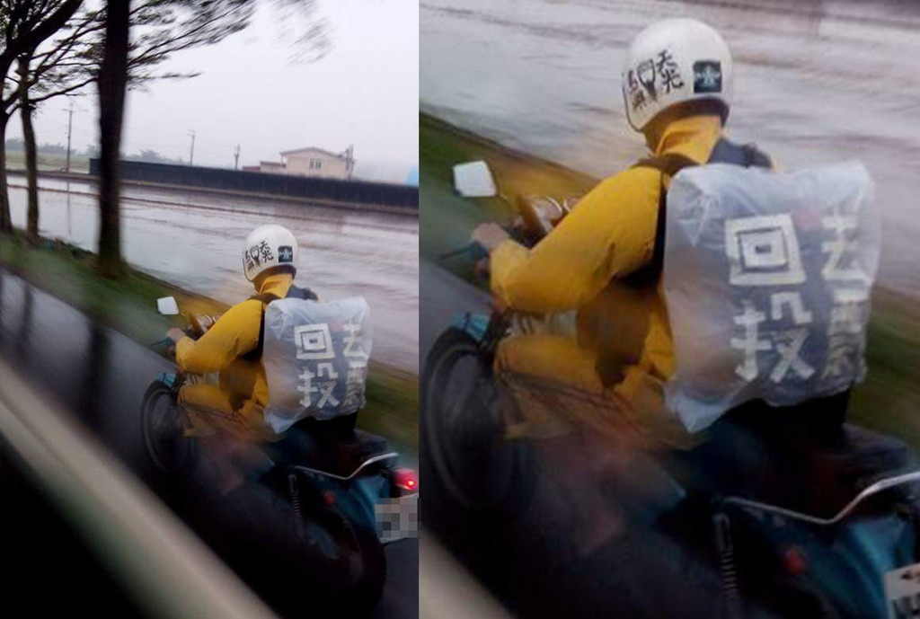 民眾表示,這張照片是在東山往六甲的路段所拍攝下的照片,這位騎士不畏寒風,騎著擋車、淋著雨奔馳在鄉間,只為了「回去投票」,不僅如此,他的安全帽上還寫著「島嶼天光」四個字,不免讓人想起2014年太陽花學運之際,台灣人民團結反黑箱服貿的熱血「現在是彼一工,勇敢的台灣人!」