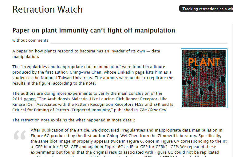 國外網站《撤銷論文觀測站》(Retraction Watch)繼11日報導台大能源計畫研究助理呂錫民涉一稿多投後,14日再爆台大植物科學研究所團隊投稿到《植物細胞》(The Plant Cell)期刊的論文由通訊作者、台大植物所瑞士籍教授金洛仁要求撤回,因為在實驗結果圖表涉及「不正當的資料操弄」(irregularities and inappropriate data manipulation),即便研究團隊重做實驗也無法得出相同結果,認為對論文的部分結論有質疑。