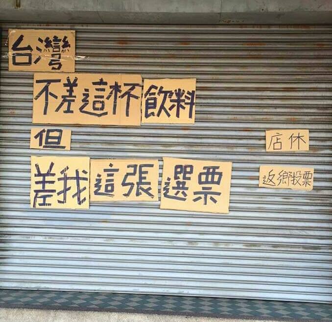 臉書「麵線新聞」今日貼出一張照片,某店家在鐵門上用好幾張紙板寫下,台灣不差這杯飲料,但差我這張選票,並註明「店休,返鄉投票」,經轉載後被許多網友推爆。