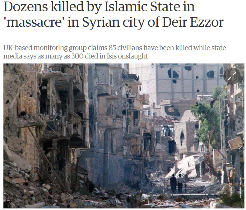 激進組織「伊斯蘭國」在敘利亞東部大城戴爾祖爾(Deir Ezzor)至少殺害了85名平民以及50名政府軍。敘利亞官方媒體表示,這是一場「大屠殺」。