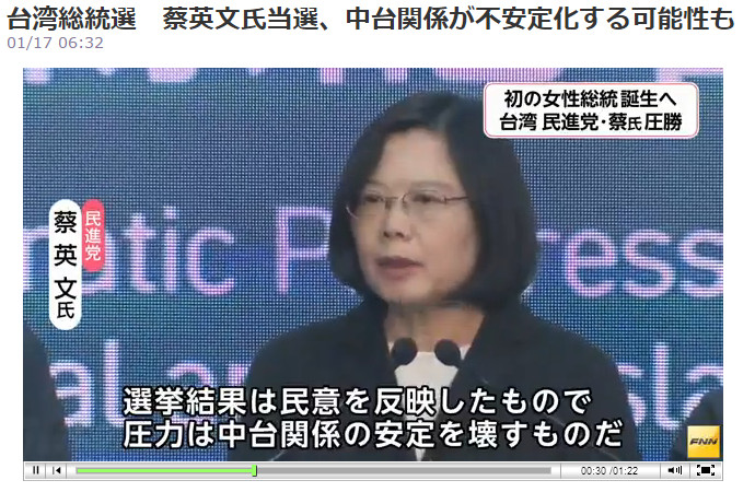 日本富士電視台報導,台灣16日的選舉不僅實現了政黨輪替,蔡英文的當選也令中華民國誕生了首位女總統;然而,民進黨一直以來台獨傾向明顯,今後台灣與中國的關係很有可能變得不穩定。