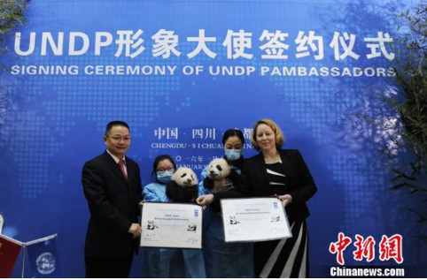 在這次的活動中,聯合國開發計劃署國別主任文靄潔,和成都大熊貓繁育研究基地主任張志和一起為「慶賀」雙胞胎寶寶任命為「UNDP形象大使」一事進行簽約。此外,模樣可愛的雙胞胎熊貓也在協議書上「簽名」自己的小掌印。