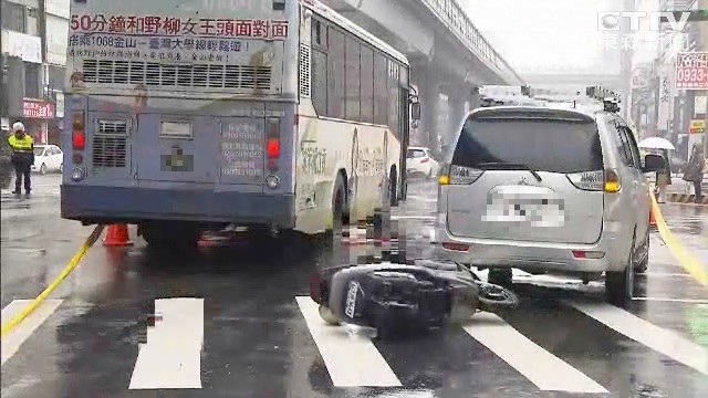 台北市八德路、復興北路口19日上午發生車禍,一名30多歲女騎士先撞上廂型車倒地,又遭後方基隆客運輾過、卡在公車右後輪,送醫前沒有呼吸心跳。