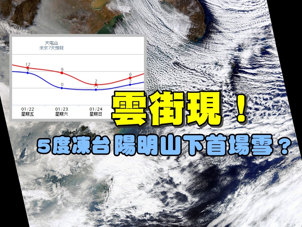 大寒後10年最冷寒流要來了!中央氣象局表示,這波強烈大陸冷氣團將影響至清晨,20日各地低溫仍下探12度左右,冷空氣不斷南下,衛星影像中更出現「雲街」。而23日(周六)首波寒流南下報到,全台急遽降溫,越晚越冷,24至25日(周日至下周一)是影響最明顯時候,預計北部低溫下探5度,甚至不排除大台北陽明山有下雪機會。