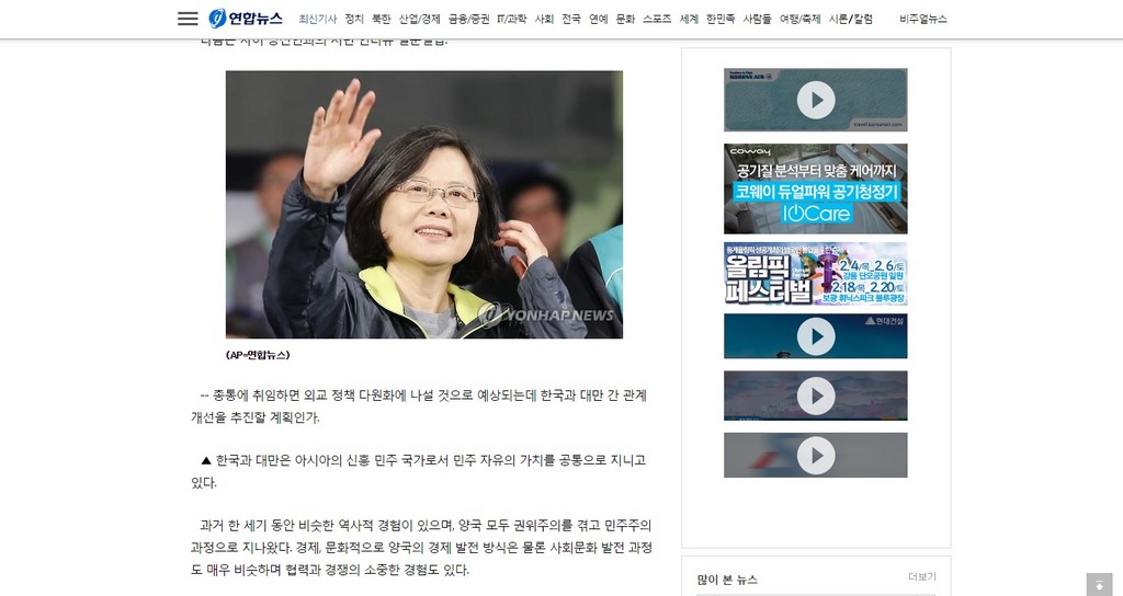2016大選落幕,民進黨主席蔡英文成台灣首位女總統,引來全球矚目,《韓聯社》19日發表一篇獨家專訪指蔡英文首次接受韓國媒體訪問,對此,民進黨透過聲明澄清,報導內容是引用蔡英文歷來談話,並非真的專訪。