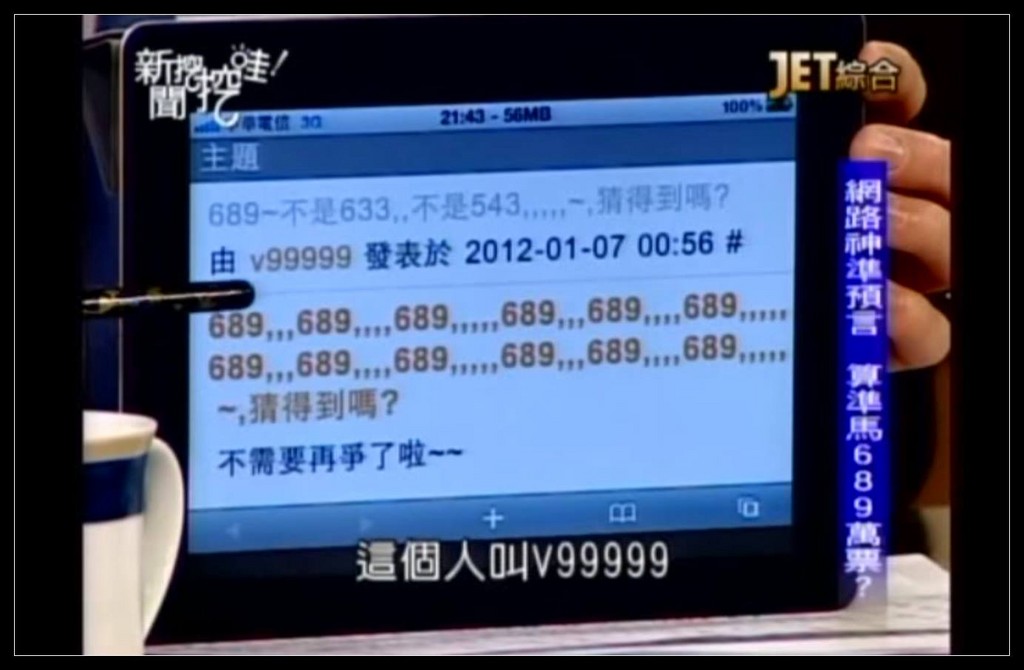 小和尚當年以「v99999」帳號於2012年1月7日於未來事件交易所上PO出帖子:「689…689…689…689…689…689…689…689…689…689…689…689…,猜得到嗎?不需要再爭了啦~」但因數字看起來太過虛幻,並有沒受到關注,緊接著12日他又故弄玄虛發文:「請記得~689~別嚇一跳~請記得~689~別嚇一跳,代表什麼意思?後天再看就知道…很多事非推論與統計可得…還沒發生?其實是早就發生…很多人都是等到發生的一刻才問為什麼?其實沒有為什麼可解…它就是如此…」