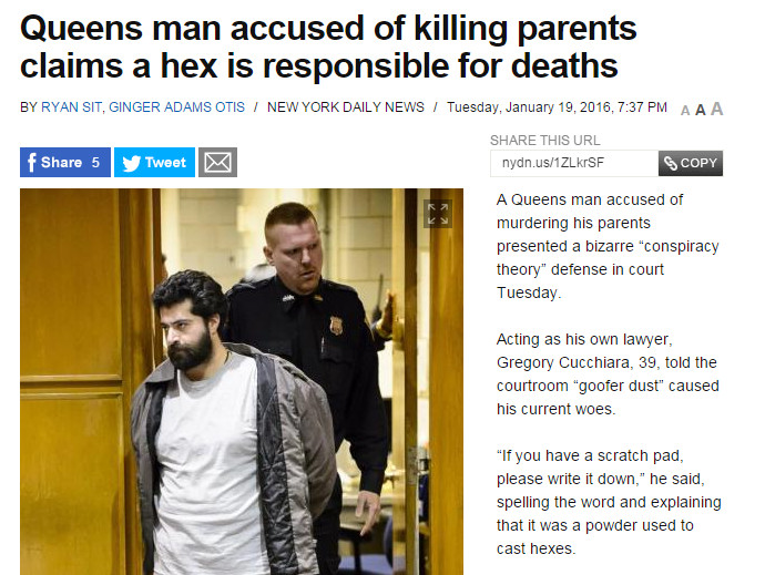 美國紐約39歲的男子古奇亞拉(Gregory Cucchiara)在2011年5月時,先毒打母親並淹死她之後,又拿枕頭悶死父親;本月19日出庭時,竟然替自己辯白,聲稱是被下蠱了。