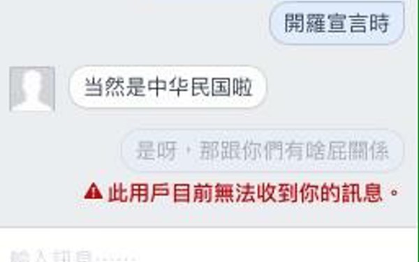 原PO回「那時候的中國是誰主政?開羅宣言時」;大陸網友回「當然是中華民國啦」。沒想到後來原PO再傳,「是呀,那跟你們有啥屁關係」,同時系統顯示傳訊失敗,「此用戶目前無法收到你的訊息」。原PO在PTT說,「我真的不是故意害你被查水表的」。