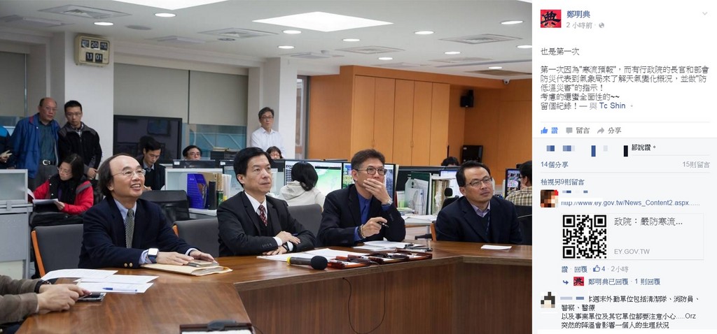 今天(21日)各地天氣雖然稍稍回暖,不過本周六(23日)預估將有超強寒流來襲,低溫下探6至8度,人的體感溫度可能還會更低,而因為實在太冷了,讓行政院官員也很關心,中央氣象局預報中心主任鄭明典就在臉書貼文,「第一次因為寒流預報,讓行政院的長官和部會防災代表都到氣象局,了解天氣變化!」