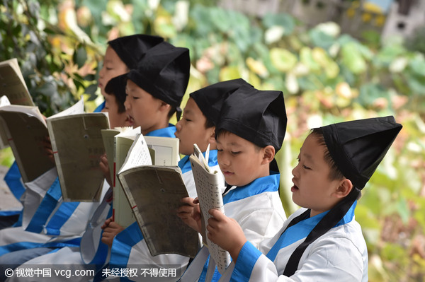 ▲幾名孩童身著漢服,在安徽省合肥市傳說中昔日包拯兒時讀書的地方誦讀國學經典,足以見到當地如何重視國家文化。(圖/CFP)