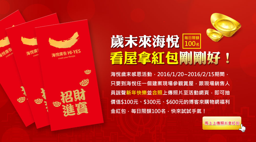 為了迎接全新的一年,房產代銷龍頭海悅團隊於今年1月20日至2月15日舉辦歲末感恩活動,只要在活動期間內到海悅任一個建案現場參觀賞屋,與現場銷售人員說聲 :「新年快樂!」,並將合照上傳照片至指定活動網頁,即有機會抽中價值$100元、$300元、$600元的博客來購物網福利金紅包喔!快來試試今年的手氣吧!