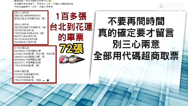 台鐵春節預售票周一(18日)開票,馬上就搶翻賣光了,但現在卻有人能大肆搶票,還要讓票,這篇讓票的PO文寫道,「嚴禁退票!」而且說明了車次的詳細時間,全部用超商代碼取票,一共有106張台北到花蓮的車票,其中普悠瑪號和太魯閣號更高達72張,分別是用惡意程式掃票,對此台鐵營業課長陳裕謀表示,「已向警方報案。」