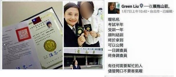 去年12月結訓的劉淑婷,當時接受媒體訪問時表示,從小就受到父親耳濡目染,希望自己未來也能為國家盡一份心力,所以選擇投身調查局。想不到,今年1月7日她在臉書打卡說,「考試半年,受訓1年,順利結訓,終於拿到,可以公開,一日調查員,終身調查員,有任何需要幫忙的人,儘管開口不要客氣喔」。