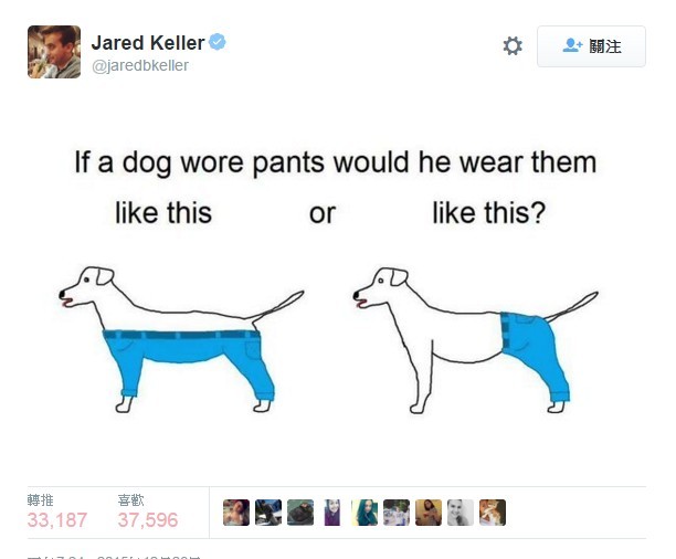 男性雜誌編輯凱勒(Jared Keller)在推特上發問,「狗狗穿褲子,應該穿2條腿還是4條腿呢?」並附上示意圖片,引來3萬多名網友熱烈討論,有網友認為只要穿2條腿,有人卻認為應該全部穿上,還有許多人上傳自家狗狗的示範圖片,意外掀起一番口水戰。