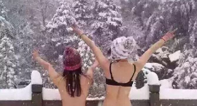 台灣正面臨「霸王級」寒流入侵,許多人拿出厚外套、暖暖包禦寒,不過浙江杭州有2位超熱血女孩,其中一位上半身全裸,另一位則是脫掉上衣、留下黑色胸罩,她們在雪地中高舉雙臂,這組照片被PO到微博後,還註明是要祈求上天「賜男友」。