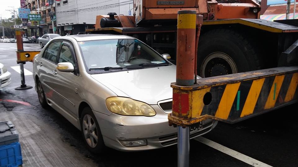 《爆料公社》一名網友23日上傳一張照片說,他違規停車在十字路口轉彎的地方,然後下車去買東西大約半小時,回來卻發現愛車被吊車的支撐架封鎖,車輛完全無法動彈,他覺得很新奇地說,「這是最新的鎖車方式嗎。」便把照片PO上網分享。
