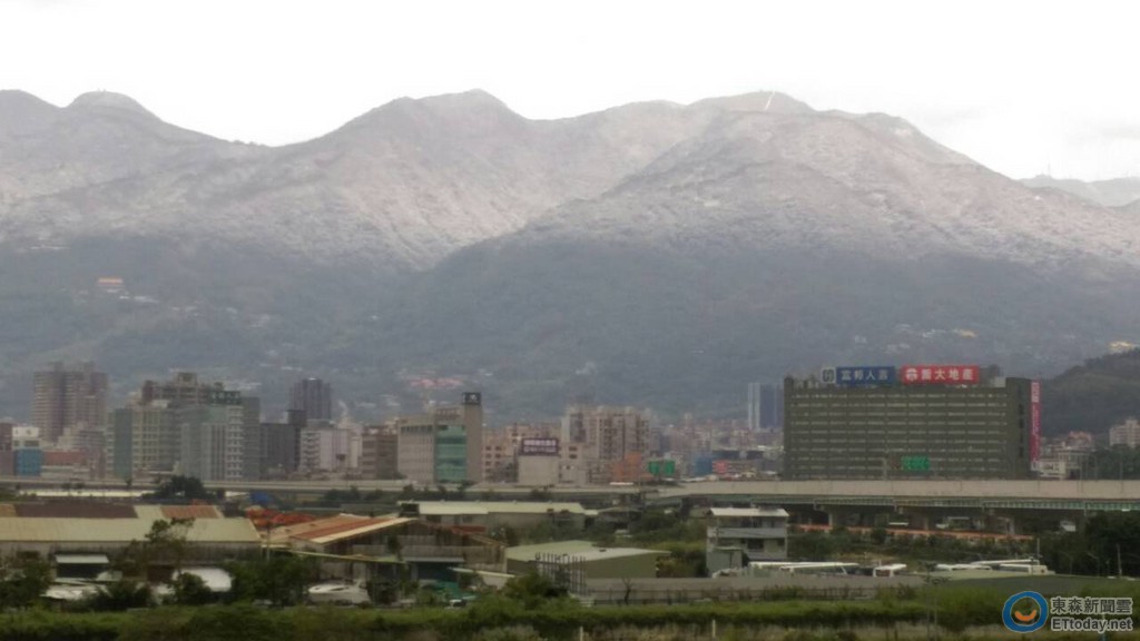 ▲從台北市區往山上看去,山頂白茫茫一片。(圖/民眾提供)