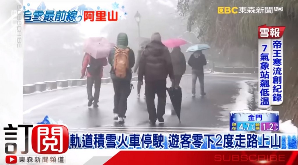 霸王級寒流襲擊全台,各地民眾瘋追雪,25日阿里祝山線因軌道積雪,為安全考量,觀日列車暫停行駛,但許多遊客不願大老遠跑來卻撲空,乾脆頂著零下2度的低溫走上山,沿途都是積雪,走了2個多小時才抵達觀景台。