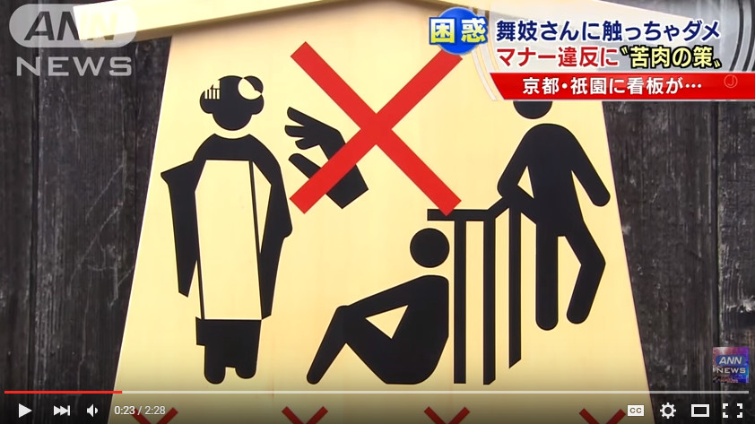 祇園町南側地區協議會會長高安美三子表示,「祇園不是兒童樂園,卻有人把藝伎當成米老鼠!不只在路上追著他們跑,還會闖進屋內對他們隨意拍攝,非常恐怖!」也有人稱,有中國遊客朝藝妓背後丟擲未熄火的菸蒂,讓京都市向中國領事館表示遺憾,但媒體對這件事卻很奇怪的全無報導。