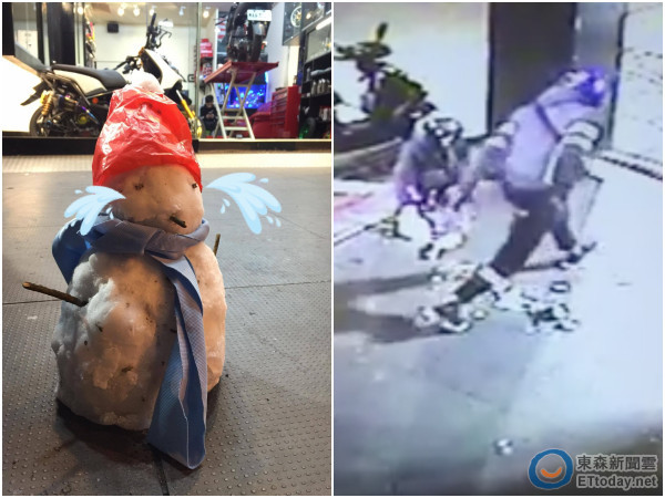 張先生將監視器畫面PO上網,發現一輛摩托車停靠店門口,後座的女生蹲下身子,先是看著雪人一會兒,接著就要男生幫她拍照。最後,女生竟然直接把雪人的頭拔起來,往男生腳下丟,還拿「破碎的身體」打起雪仗來,隨後騎車揚長而去。