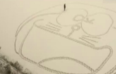 畫面中可見,黑衣男用小碎步來回走動,思路清晰的他在雪地上踩出重重痕跡,同時也要有精準的步伐,才能把五官、表情到頭型都「走」得這麼到位,一個哆啦A夢的輪廓就這樣慢慢出現。