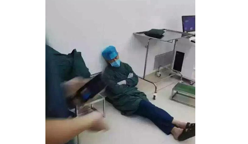 這張照片最近在大陸微信朋友圈裡被大量轉發,只見這名醫護人員穿著手術服,戴著口罩和白手套,雙手交叉在胸前,就這樣坐在地上睡覺。原來他是哈爾濱醫科大學附屬第四醫院泌尿外科主人徐萬海,據了解,他因為連續加班24小時,而累到在手術台旁直接睡著了。