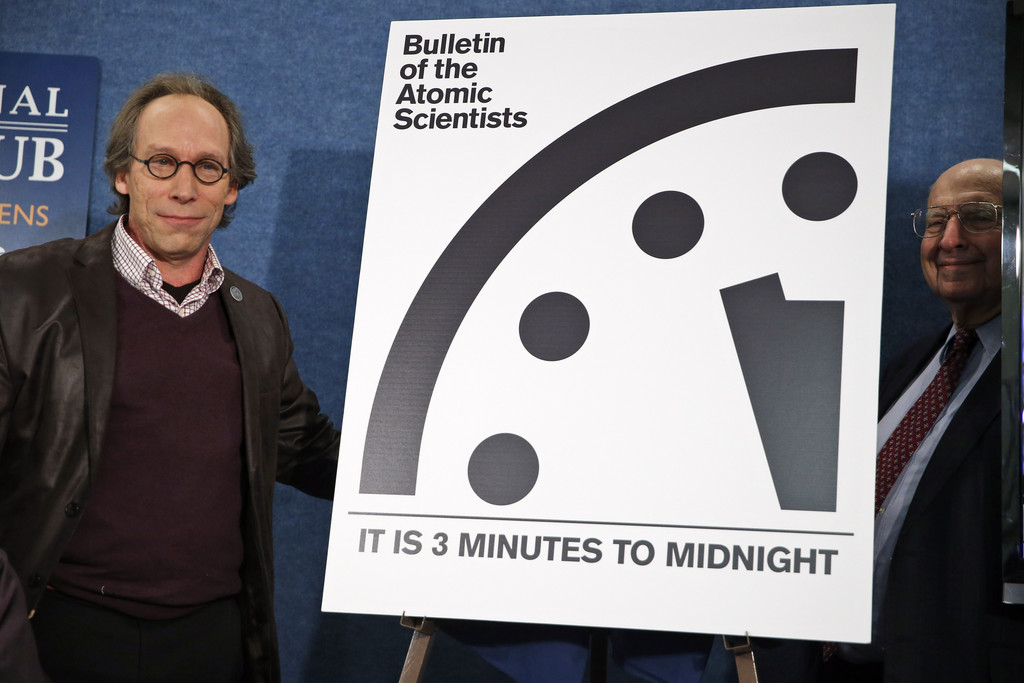 《原子科學家公告》說:「世界局勢充滿毀滅陰影,但仍有進展給持續的灰暗帶來些許光亮」。自從2015年1月以來,「末日之鐘」的時間一直停留在距離午夜3分鐘的位置。