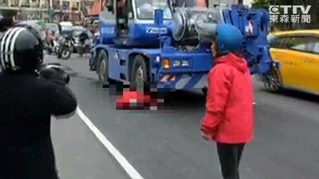 曾姓騎士今天上午9時許行經金城路,路邊停車的白色貨車卻突然打開車門,導致他來不及閃躲、擦撞倒地,這時後方一輛吊車煞車不及,直接輾過石女。目擊民眾表示,當時貨車突然打開車門,就撞到老先生、老太太,「男的都不動,女的還有一點意識。」