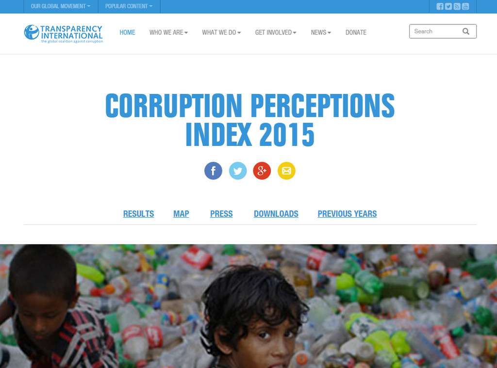 國際透明組織(TI)27日公布「2015年貪腐印象指數」(CPI),丹麥連續第二年拔得頭籌,而台灣則排名第30名,進步了5個名次;中國大陸以及俄羅斯則分別為83名以及119名。