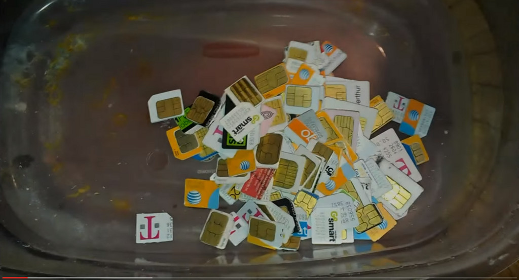 被認為完全不具價值的舊手機SIM卡竟然能夠練出「黃金」?YouTube上一名國外男子便成功煉金,且將他煉金的過程完全透明公開,先看見他先把一堆舊SIM卡集中放入一長方形容器內,加入1:1的雙氧水(過氧化氫)及鹽酸後,將容器密封並靜置24小時。