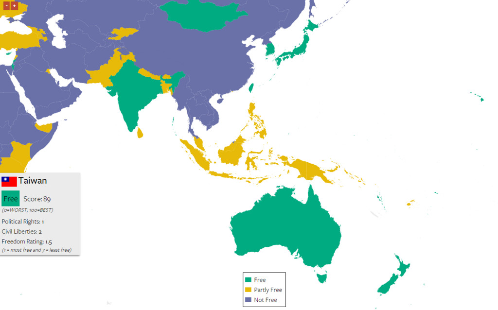 國際性非政府組織「自由之家」(Freedom House)27日公布最新年度報告,針對全球的自由程度進行評比,在自由度最高100分的標準下,台灣獲得89分的超高肯定,不僅是亞太地區少數幾個被評定為「綠色(自由)」的國家或地區,更是獲得僅次於亞太地區第一自由日本(96分)的排名。