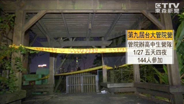 出事涼亭被拉上封鎖線,勒昏男大生的童軍繩還綁在樑柱上,台大管理學院昨晚舉辦高中生營隊活動,在一場夜間闖關遊戲中,謝姓男大生在涼亭當關主,脖子套著繩子、人站在涼亭的木椅上扮演吊死鬼嚇人,結果真的遭勒昏,同學發現時,他已經失去呼吸心跳,送醫搶救後仍陷入昏迷。