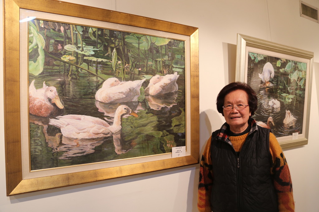 林老師創作多為印象派寫實風格,此次展出作品中,描繪台中公園荷花池一角的鴨子「下暑荷塘」獲得台灣國展入選。林老師花費七天時間貼近觀察群鴨生活動態,畫面中水波映照水塘嬉遊的白鴨荷葉,充滿悠然閒適的氣氛。