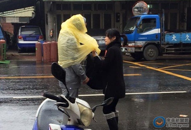 網友李鴻明昨日下午在回家的路上看一位老人家,一跛一跛的走在雨中還沒拿傘,也沒有路人搭理,正想著要幫他買個雨衣時,一位好心姊已迅速上前幫老伯穿上雨衣。目睹整個經過的他超感動,立刻將暖心的畫面拍下來與大家分享。