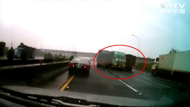 行車記錄器顯示,天雨路滑,國道上車輛紛紛減速,突然看到前方一輛聯結車急踩煞車,3輛大車撞在一起,車子180度旋轉,車上副駕駛座的人還被甩出車外。