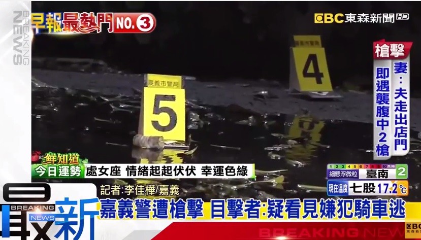 嘉義一名46歲的保安隊林姓員警昨天(29日)晚間10點多,在太太開的藝品店遭人埋伏,用霰彈槍開了兩槍,造成他左上腹中彈,緊急送醫院後,仍在凌晨1點多宣告不治,而有目擊者出面表示,「當時看到有人從店門口騎車離去,疑似就是嫌犯。」警方也在現場找到3枚彈殼,持續追緝中。