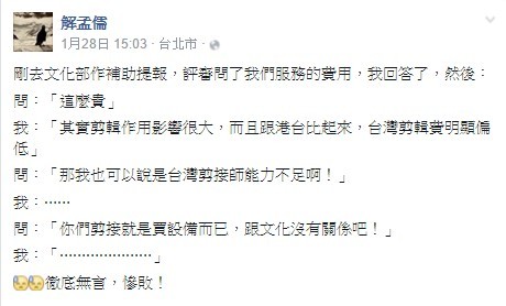 解孟儒寫道「剛去文化部作補助提報,評審問了我們服務的費用,我回答了」,然後評審回答「這麼貴」。他則回應,「其實剪輯作用影響很大,而且跟港台比起來,台灣剪輯費明顯偏低」。沒想到評審卻說,「那我也可以說是台灣剪接師能力不足啊!」