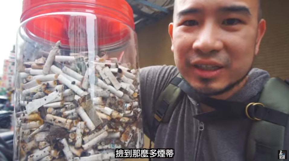 ▲實際撿起北市天津街的菸蒂,有一大桶的菸蒂。(圖/翻攝自《台客劇場》YouTube)